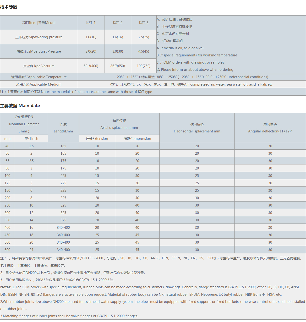 | 注:1、特殊要求可按用戶圖紙制作,可選配(GB、JB、HG、CB、ANSI、DIN、BSEN、NF、EN、JIS、 等)法蘭標(biāo)準(zhǔn)生產(chǎn)。橡膠球體可做天然橡膠、三元乙丙橡膠、氯丁橡膠、丁基橡膠、丁腈橡膠、氟橡膠等。 2、懸空給水使用DN200以上產(chǎn)品,管道必須有固定支撐或固定托架,否則產(chǎn)品應(yīng)安裝防拉脫裝置。 3、用戶使用橡膠接頭,對(duì)應(yīng)法蘭應(yīng)是閥門法蘭。 Notes: 1. For OEM orders with special requirement, rubber joints can be made according to customers' drawings. Generally, flange standard is , other GB, JB, HG, CB, ANSI, DIN, BSEN, NF, EN, JIS, flanges are also available upon request. Material of rubber body can be NR natural rubber, EPDM, Neoprene, IIR butyl rubber, NBR Buna-N, FKM, etc. 2.When rubber joints size above DN200 are used for overhead water supply system, the pipes must be equipped with fixed supports or fixed brackets, otherwise control units shall be installed on rubber joints. 3.Matching flanges of rubber joints shall be valve flanges or flanges. | ||||||